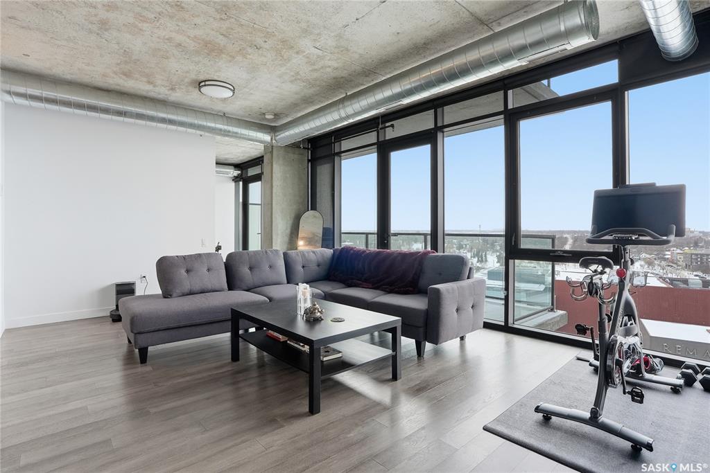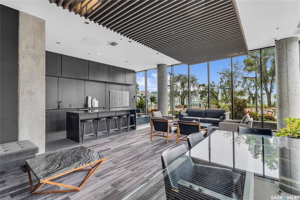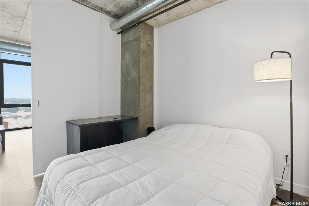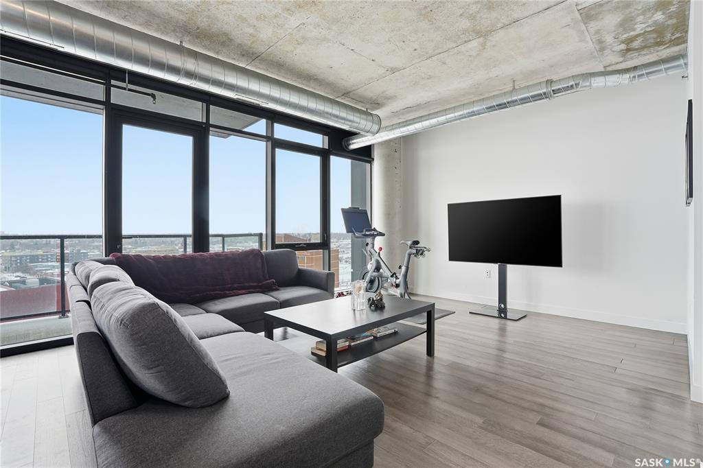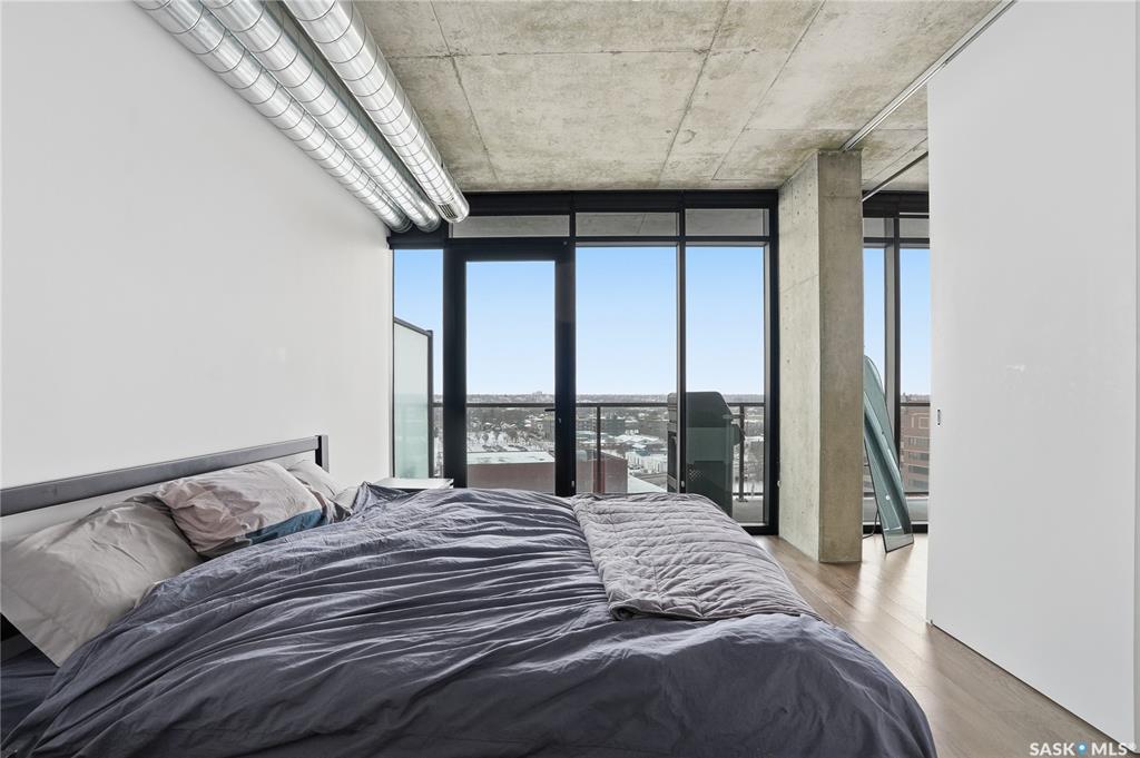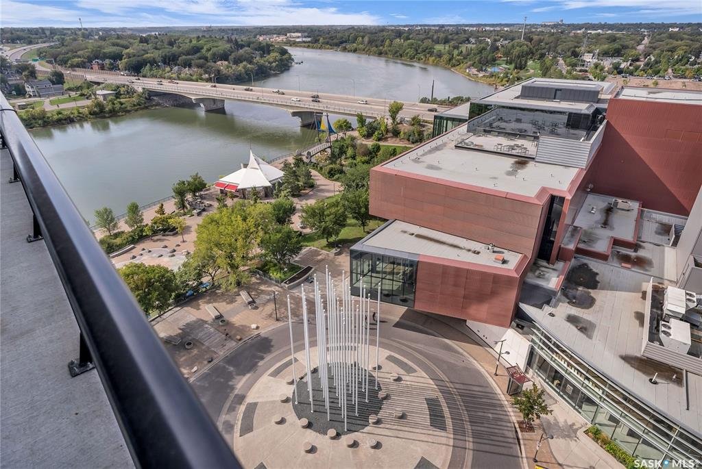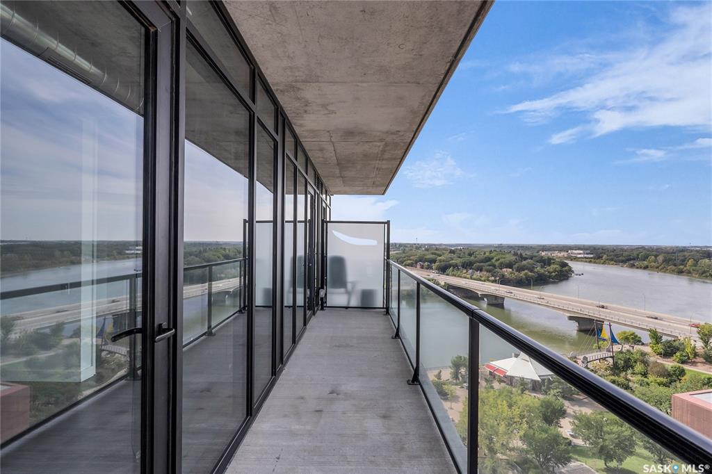 Stunning 13th floor unit at No. 1 River Landing, featuring an expansive view of Saskatoon's downtown, River Landing Park and the South Saskatchewan River. Great layout with 9 ft concrete ceilings, kitchen with quartz counters and stainless steel appliances, 2 bedrooms + den and two bathrooms. Primary bedroom has direct access to the balcony and features a walk-thru closet open to your ensuite with a tiled shower. Second bedroom has a large closet and sliding door entry. Laundry (new washer & dryer!) and add...