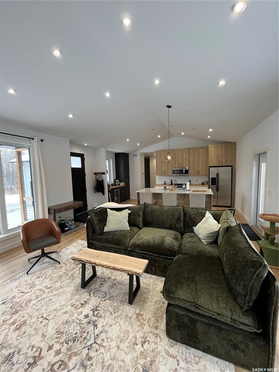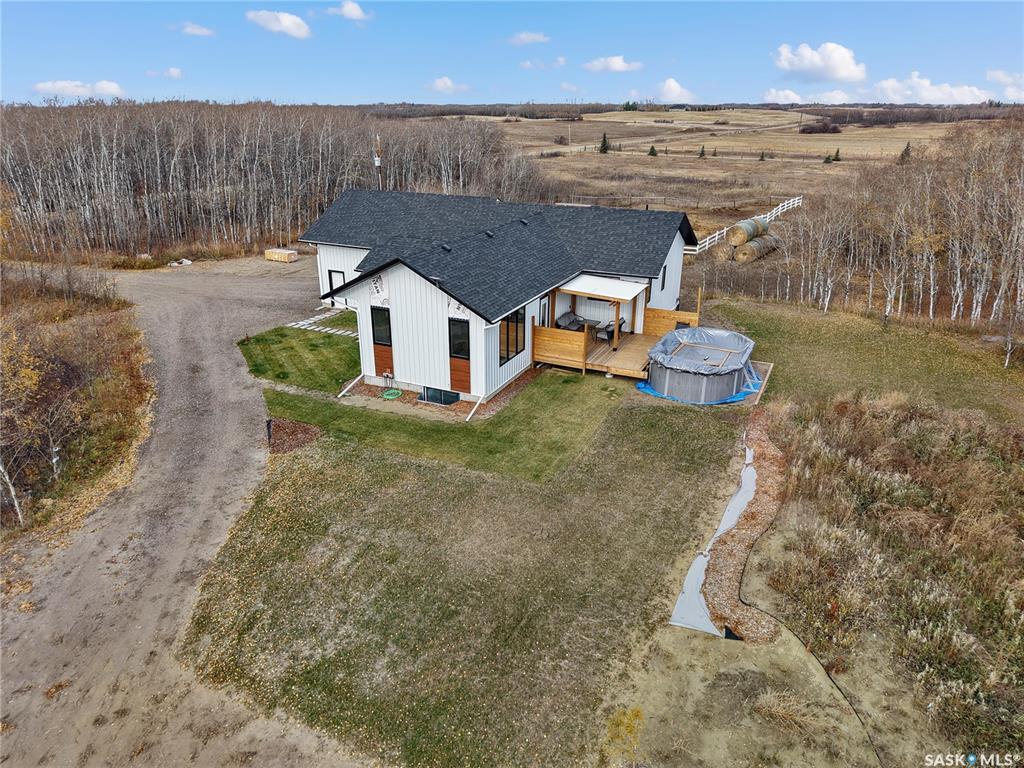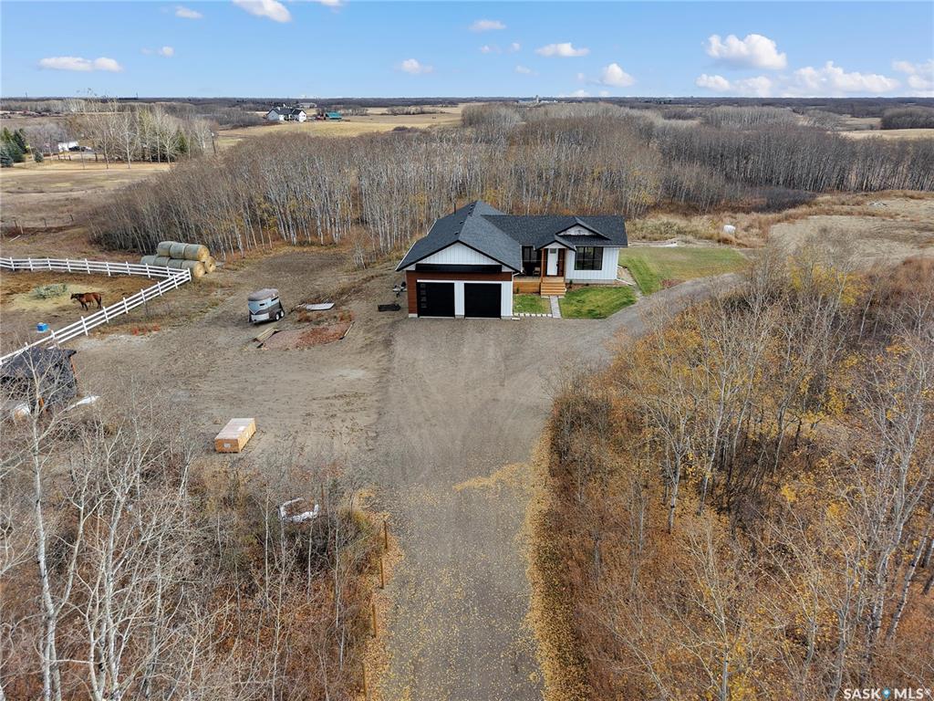 Welcome to this nearly-new acreage just 15 minutes from Saskatoon, offering modern efficiency, natural gas heat, Starlink internet, and horse-ready infrastructure already in place. Surrounded by mature trees and rolling hills. Built in 2024, this 1,353 sq/ft bungalow features an open concept main floor, quality finishes, and a bright, functional layout. 3 bedrooms and 2 bathrooms upstairs. The lower level is wide open and ready for future development, with space for two more bedrooms, a family room, and...